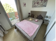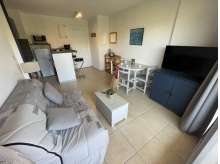 Ce logement fonctionnel se compose d'une entrée sur un séjour climatisé avec canapé-lit BZ, un coin cuisine toute équipée avec lave-vaisselle et frigo avec congélateur intégré, une salle d'eau avec wc, un lave linge dans placard couloir, une chambre avec un lit double (literie neuve) donnant accès à la terrasse.