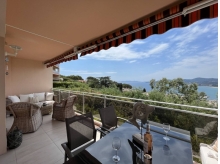 Vous séjournerez dans un magnifique appartement digne d'un 4 étoiles, avec vue surplombant la baie du Lavandou et les Iles d'Or. Idéal pour 2 couples, il se compose d'une entrée desservant côté Nord une cuisine indépendante toute équipée avec fenêtre lave-vaisselle, un combiné lave-linge/sèche-linge et frigo à compartiment congélateur, une chambre avec fenêtre et lit double + TV, WC indépendant, une salle d'eau, côté Sud un grand séjour-salle à manger avec rafraichisseur d'air, donnant sur une terrasse offrant une magnifique vue sur la mer et une chambres avec 2 lits simples rassemblés en 1 + TV donnant également sur la terrasse avec son petit coin repos et sa vue imprenable sur la belle bleue.
