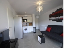 Tout confort, il se compose d'une entrée desservant un couloir sur la droite avec accès à la salle d'eau et son wc, un séjour avec canapé-lit clic-clac, un coin cuisine toute équipée avec lave-vaisselle, lave-linge et frigo à compartiment congélateur, une chambre avec deux lits en 90 joints et équipés d'un surmatelas pour plus de confort lorsque vous le transformez en lit double 160, sa télévision et son accès direct à la terrasse.