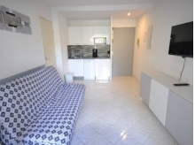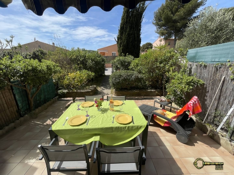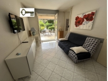 Vous séjournerez dans un appartement en rez-de-jardin composé d'une entrée desservant un coin cuisine équipée entièrement rénovée, avec un lave vaisselle, un séjour climatisé avec clic-clac et TV, une salle d'eau entièrement refaite à neuf avec douche à l'italienne + WC + lave linge, une chambre avec un lit double et une fenêtre, une loggia fermée par des baies entièrement coulissantes avec un frigo à compartiment congélateur, une grande terrasse carrelée et un jardinet côté ouest, arboré et fleuri.