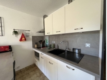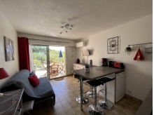 Il se compose d'un couloir desservant une chambre avec deux lits simples, une fenêtre et un placard, une salle d'eau, un wc indépendant, un coin cuisine type américaine toute équipée neuve, avec lave-linge et frigo Top, un séjour avec un BZ de qualité et TV, donnant sur une terrasse joliment arborée et exposée Sud-Est.