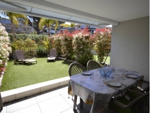 Exposé Sud, en rez de jardin, il dispose d'une grande terrasse pour y déjeuner et un beau coin détente avec bains de soleil pour lézarder.