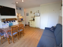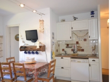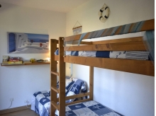 Ce logement "aux airs marins", idéal pour 1 couple et 2 enfants, se compose d'un couloir desservant une salle d'eau avec wc, un séjour avec canapé rapido convertible en 160, un coin cuisine toute équipée avec lave-vaisselle et frigo à compartiment congélateur, une chambre avec deux lits superposés et une chauffeuse simple d'appoint donnant accès à la terrasse.