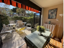 Vous séjournerez dans un appartement en rez de jardin, composé d'une entrée desservant une chambre avec un lit double et une fenêtre, une salle d'eau avec wc, un séjour climatisé avec un clic clac et une TV, un coin cuisine toute équipée avec frigo à compartiment congélateur, une loggia fermée côté Sud desservant un jardinet privé.
