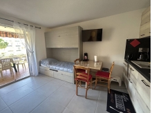 Vous séjournerez dans un appartement au 2ème étage, COMPLETEMENT REFAIT A NEUF, composé d'une entrée desservant une chambre avec un lit double et une fenêtre, une salle d'eau avec wc, appartement climatisé avec un rapido et 2 lits superposés rabattables et une TV, un coin cuisine toute équipée avec frigo à compartiment congélateur, une grande terrasse de 10m² côté Sud .