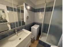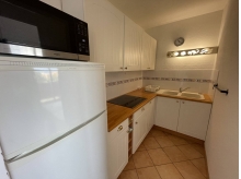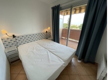 Idéal pour 1 couple et 2 enfants, il se compose d'une entrée desservant un coin nuit avec 2 lits superposés, un séjour avec canapé convertible et TV + climatisation, dans le renfoncement une cuisine avec un frigo à compartiment congélateur, une chambre avec un lit double et climatisation et un accès à la terrasse, une salle d'eau avec lave-linge et un WC indépendant.