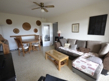 Il se compose d'un couloir desservant une cuisine indépendante toute équipée donnant sur la terrasse principale , un grand séjour-salle à manger avec un canapé et une TV offrant un accès à cette même terrasse principale, un wc indépendant, une salle d'eau avec cabine de douche et fenêtre, une chambre avec lit en 160 et son balcon indépendant, une seconde chambre avec 2 lits superposés + 1 lit simple et un balcon indépendant.