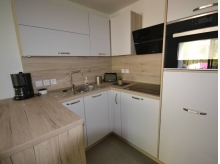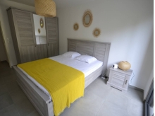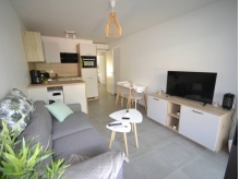 Tout confort, il se compose d'une entrée desservant une chambre avec un lit double en 160x200, une porte fenêtre pour accéder à la terrasse côté nord où un coin détente vous attend, une cabine avec deux lits superposés et son accès à la terrasse côté nord, une grande salle d'eau avec un WC, un coin cuisine toute équipée avec frigo, lave-linge et lave-vaisselle, un beau séjour avec canapé-lit convertible donnant accès à la terrasse principale et son jardinet.