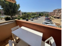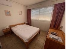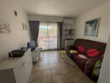 Ce logement fonctionnel se compose d'une entrée sur un séjour climatisé avec canapé-lit clic-clac +TV, un coin cuisine toute équipée avec lave-vaisselle et frigo avec petit compartiment congélateur intégré, une salle d'eau avec wc, un lave linge, une chambre climatisée, avec un lit double et grande fenêtre.