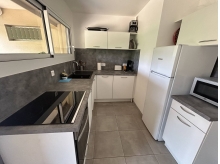 Ce logement fonctionnel se compose d' un séjour climatisé avec canapé-lit convertible +TV, une cuisine toute équipée avec lave-vaisselle et frigo avec compartiment congélateur, une salle d'eau avec lave-linge, un wc indépendant, une chambre climatisée, avec 2 lits simples en 80x190 pouvant se convertir en 160x190 et une grande terrasse côté nord.