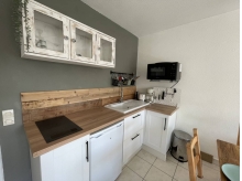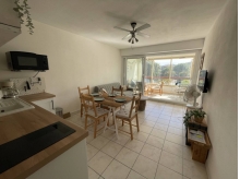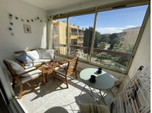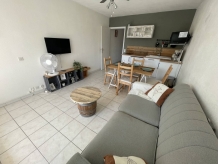 Idéal pour 3 personnes, l'appartement se compose d'un couloir desservant une cabine avec fenêtre et un lit simple de 75 pouvant devenir double pour accueillir 4 personnes, un WC indépendant, une salle d'eau avec cabine de douche, un coin cuisine avec frigo TOP + compartiment congélateur, un séjour, salle à manger avec un canapé convertible + TV, une loggia fermée par des baies vitrées exposée Sud.