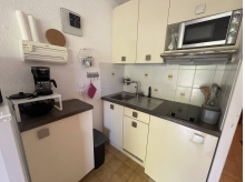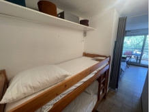 Vous séjournerez au 2ème étage avec ascenseur dans un studio cabine climatisé, idéal pour 1 couple et 1 enfant, composé d'une entrée avec un coin nuit et deux lits superposés, une salle d'eau avec WC et lave-linge, un coin cuisine avec lave-vaisselle et frigo à compartiment congélateur, un séjour climatisé avec un canapé-lit convertible+ TV et coin repas.