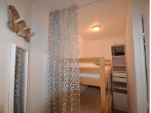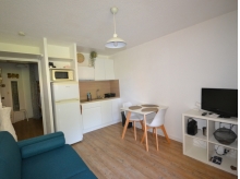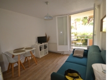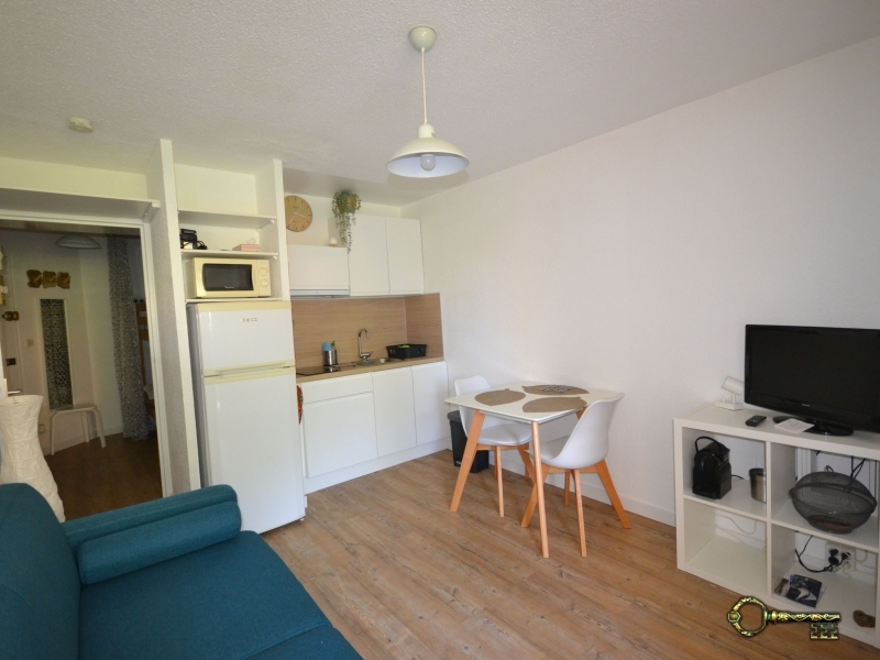 Se compose d'un hall d'entrée avec une petite cabine, un séjour avec canapé rapido + une TV , une table et chaises pour profiter des repas en intérieur, un coin cuisine avec frigo Top, une salle de bain avec WC, une loggia côté nord offrant une vue agréable sur le parc à l'intérieur de la résidence.