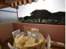 Avec sa petite vue sur la mer, les îles et le camp du Domaine, situé au 2ème étage avec ascenseur, ce studio pour 1 couple et 2 enfants, se compose d'un couloir avec placard desservant une cabine indépendante et deux lits superposés, une salle de bain avec WC, un coin cuisine avec lave-linge, frigo et petit congélateur à l'intérieur, un séjour avec un canapé-lit clic-clac, et sa loggia exposée sud.